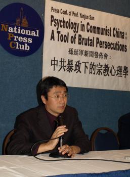 中国首都師範大学心理学の元助教授・孫延軍博士は、米国ナショナル・記者クラブで記者会見を開き、中共が宗教の科学研究を利用し、民間の宗教団体を迫害することを暴露した(撮影・亦平=大紀元…