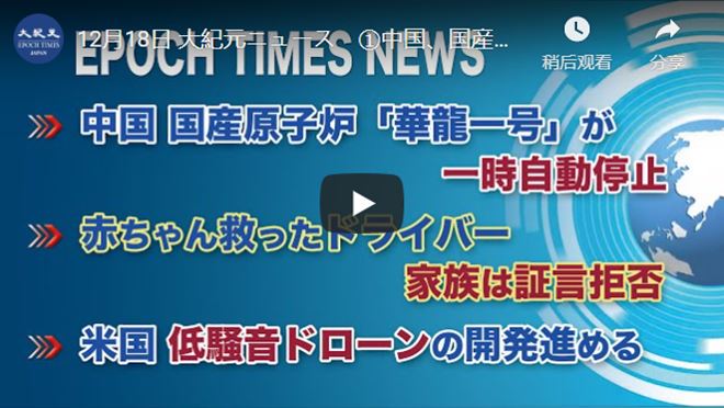 もっと見る >12月18日 大紀元ニュース ①中国、国産原子炉「華龍一号」が一時自動停止②赤ちゃん救ったドライバー、家族は証言拒否③米国、低騒音ドローンの開発進める【動画】