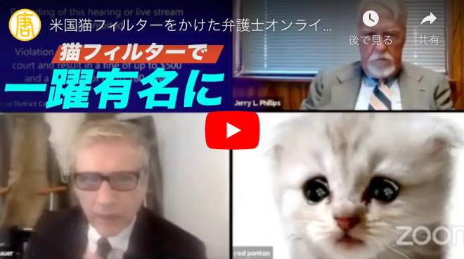 もっと見る >米国猫フィルターをかけた弁護士オンライン裁判で話題沸騰【動画】