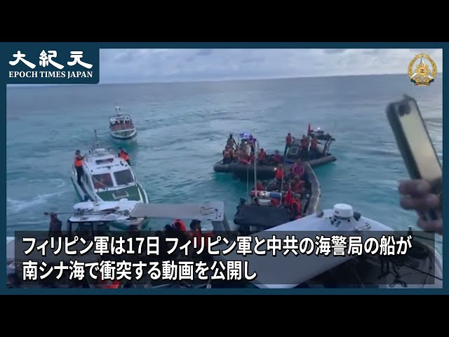 フィリピン軍は17日、フィリピン軍と中共の海警局の船が南シナ海で衝突する動画を公開し、物資を奪われたなどとして「海賊行為」だと非難。フィリピン側の兵士1人が指を切断する大けがをした…