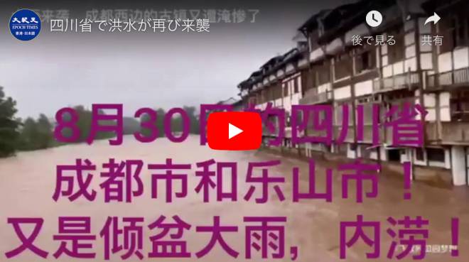【脱党支援センター2020年8月31日】 数日間の集中豪雨は、中国南西部の四川省で深刻な洪水と多数の地滑りを引き起こした。眉山市と成都市の郊外では、水位が二階まで上昇した。また徳陽…
